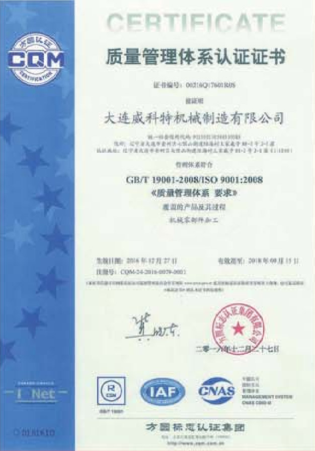 大連威科特成立于2003年,2012年搬遷至大連金州經(jīng)濟技術(shù)開發(fā)區(qū)。公司注冊資本2500萬元,占地面積25000m2,辦公地點位于大連開發(fā)區(qū)遼河西路73號融通大廈。公司現(xiàn)擁有員工68人,中高級職稱人數(shù)15人,技工30人以上,公司已通過ISO9001:2015質(zhì)量管理體系認證,擁有多項專利技術(shù),經(jīng)過多年的發(fā)展,逐漸形成了一支素質(zhì)過硬、制造經(jīng)驗豐富的管理、技術(shù)和生產(chǎn)團隊,保證了公司的持續(xù)發(fā)展和創(chuàng)新能力。
